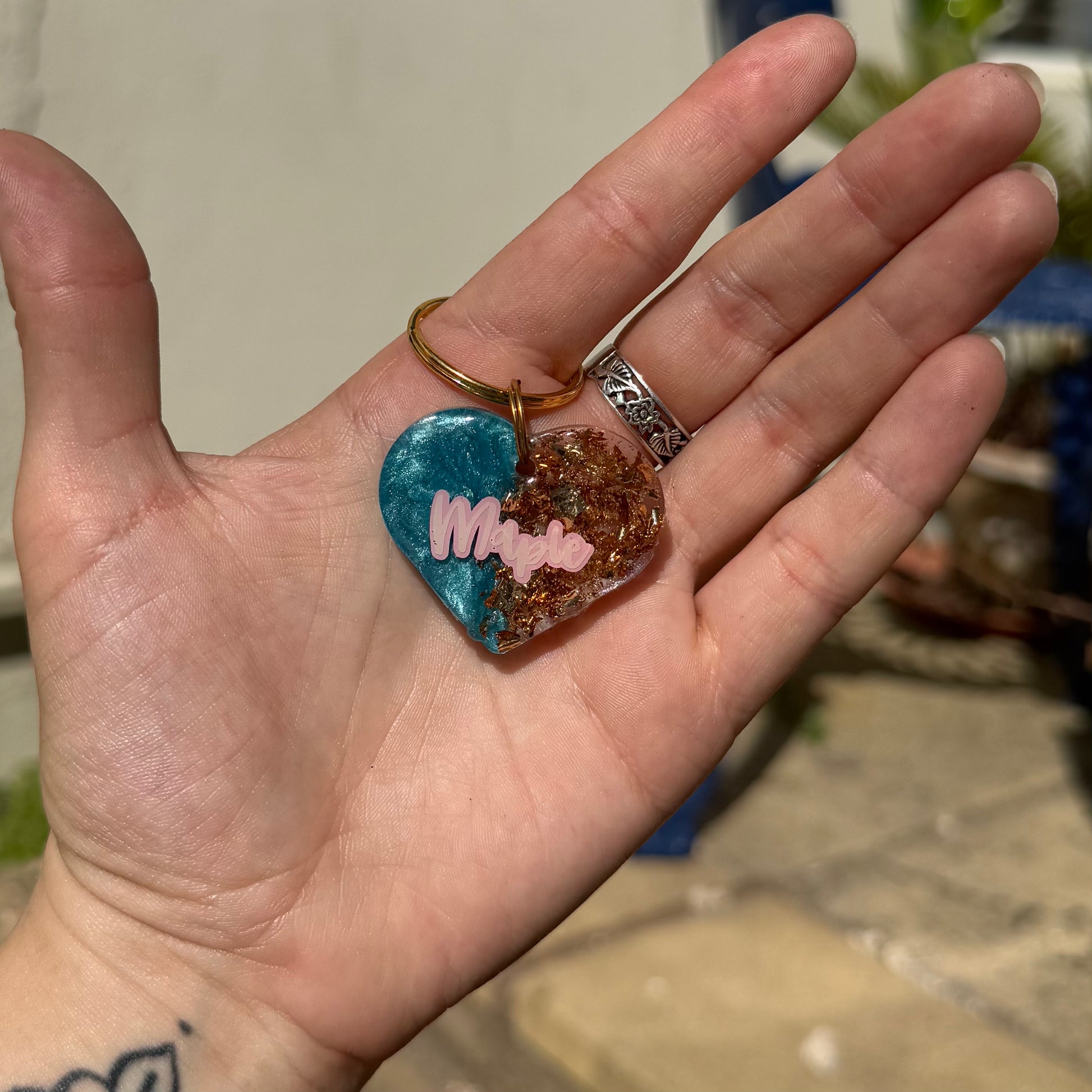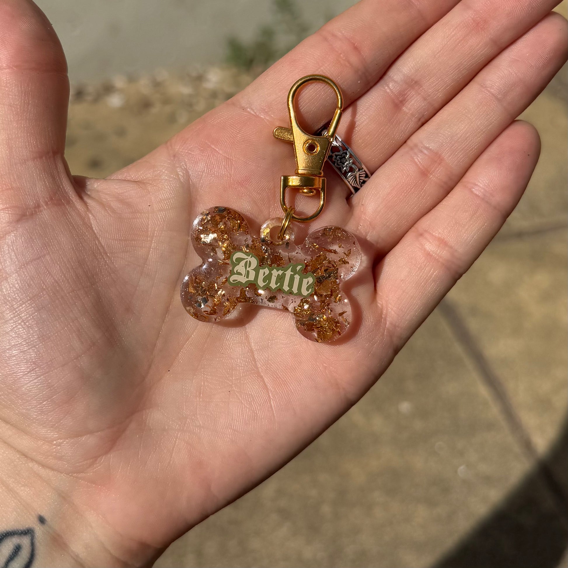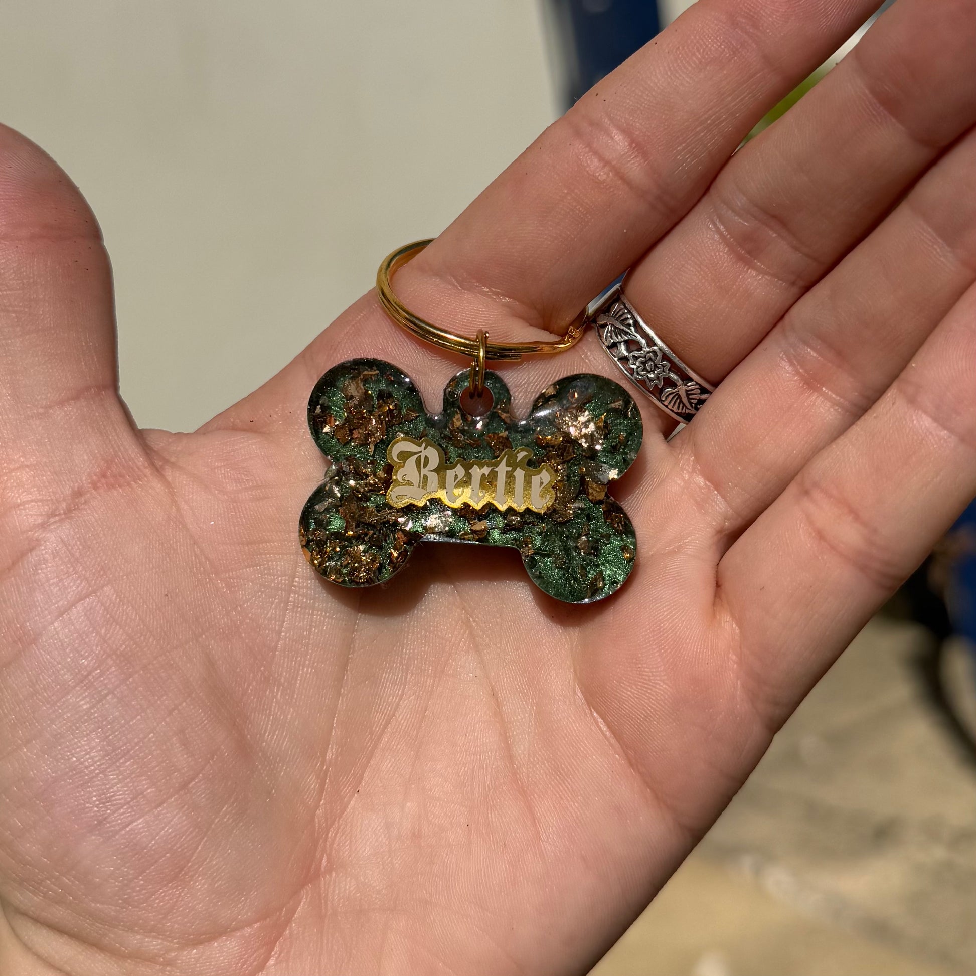 Add a touch of elegance to your pet’s look with this stunning gold leaf resin dog tag. Carefully handcrafted with shimmering gold leaf flakes encased in crystal-clear resin, or with a coloured resin base, this tag brings a luxurious finish to your pet’s everyday wear. Each piece is unique, with delicate gold accents that catch the light and make a subtle but sophisticated statement.