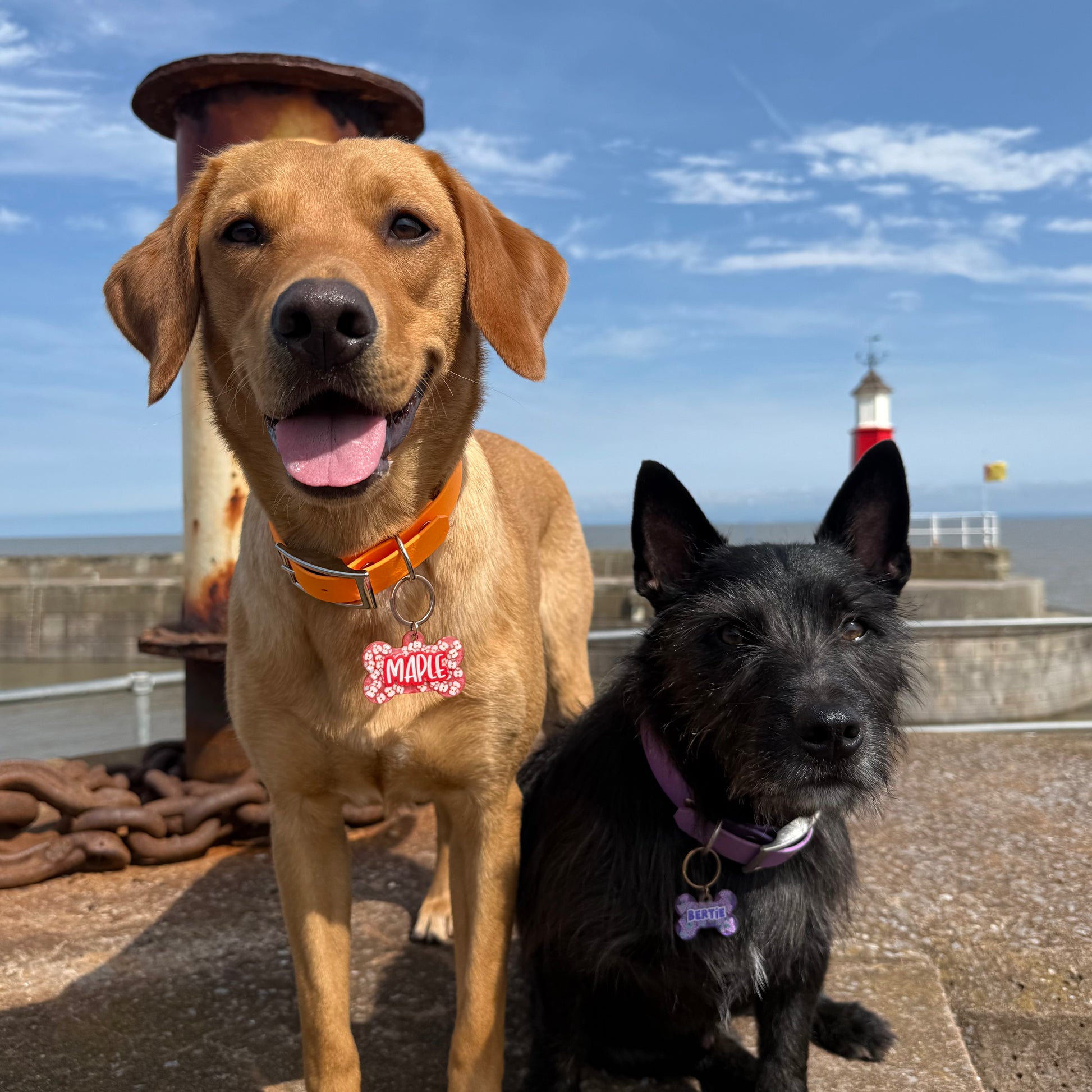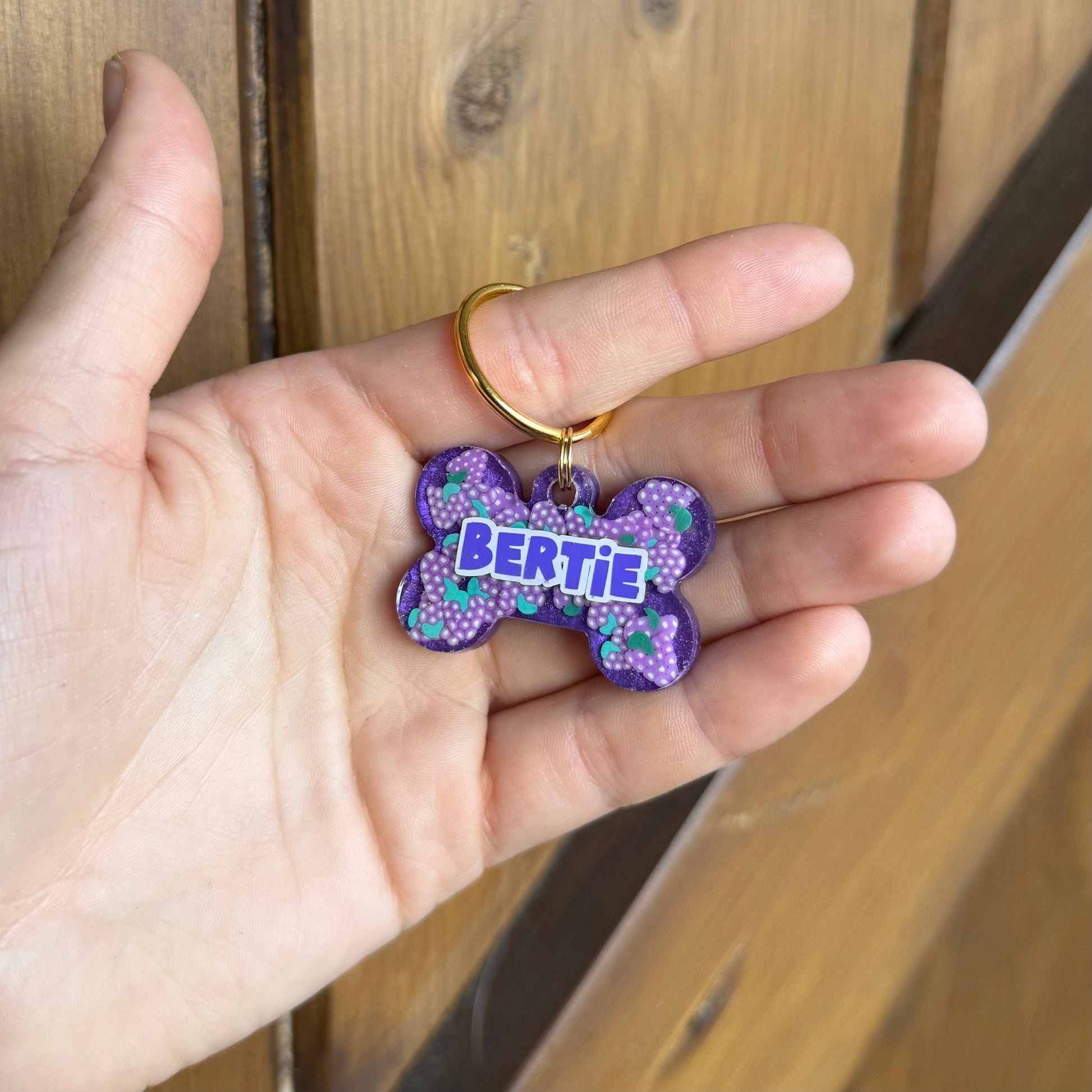 Pets name on the front and your number on the back! For the circle tags you can choose between having the pets full name or just an initial.